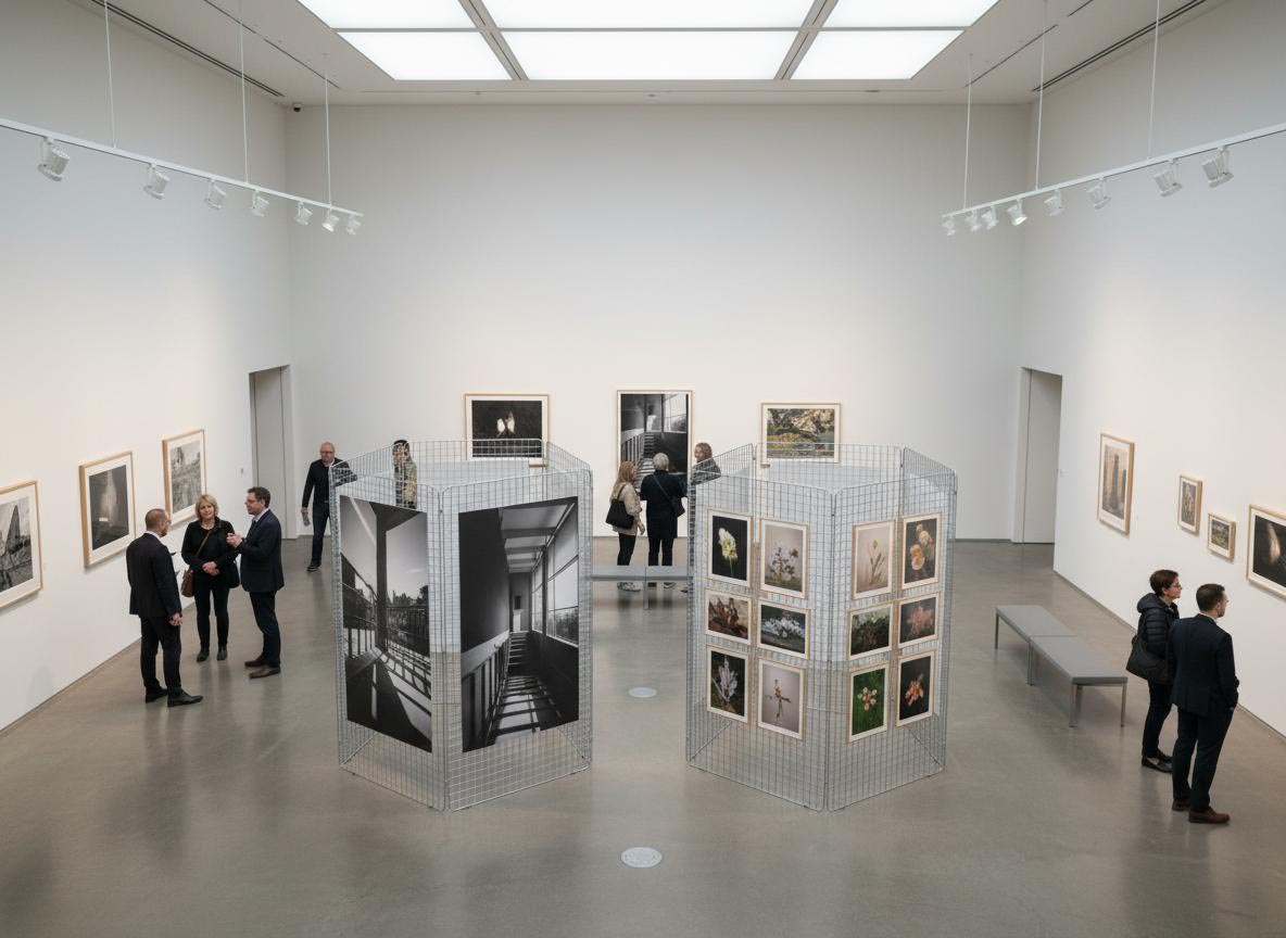 Composizioni di griglie espositive modulari maglia cm 5x5. Griglie espositive per mostre temporanee, mostre fotografiche, mostre itineranti, manifestazioni, mostre di pittura, biblioteche ed enti. Griglie espositive metalliche con finitura anche per esterno. Griglie espositive di grande formato.