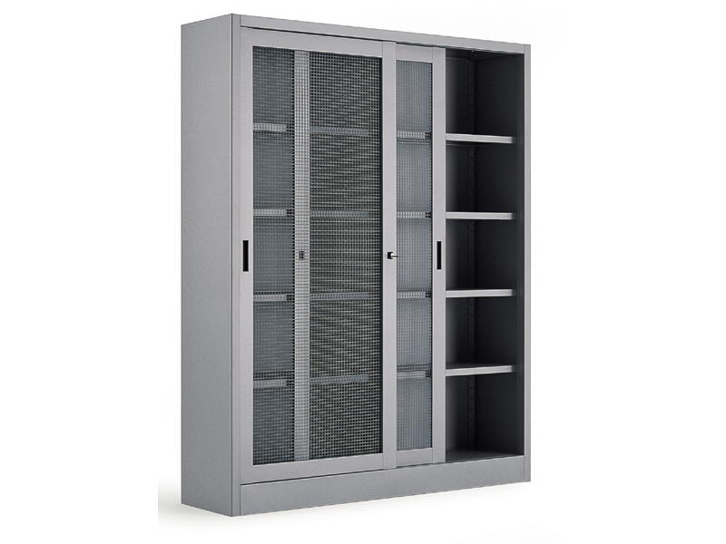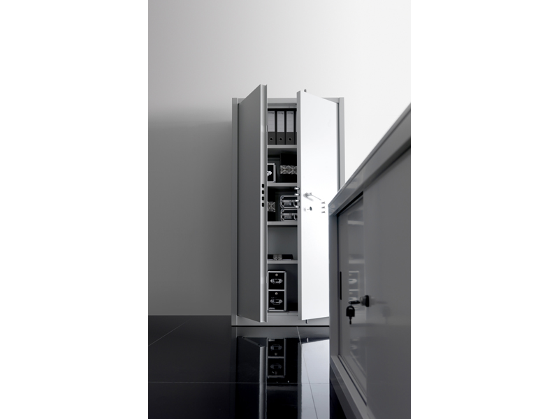 Linea di armadi in lamiera con ante in vetro, metallo e rete, armadi metallici di sicurezza. Armadi per spazi di archiviazione ed esposizione.