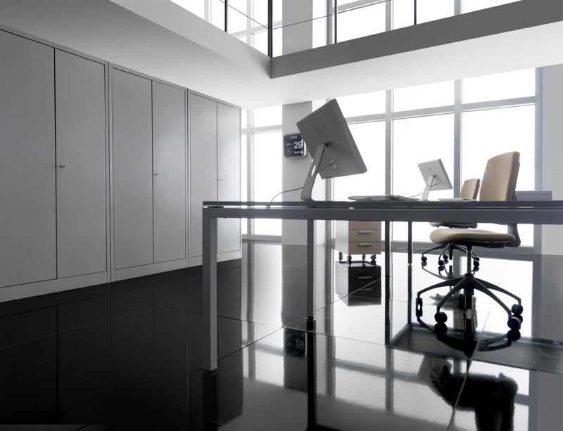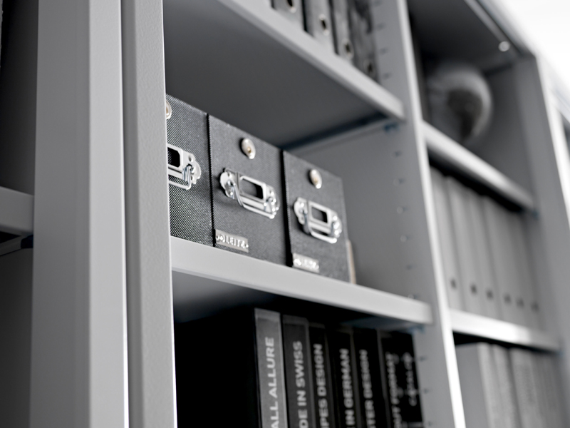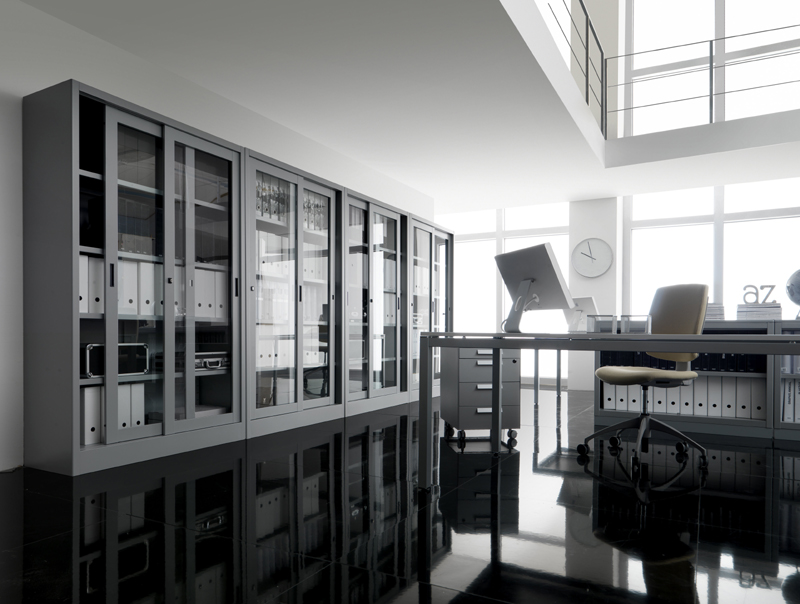 Linea di prodotti che comprende armadi con ante in metallo, vetro e rete. ideali per spazi di archiviazione ed espositivi.